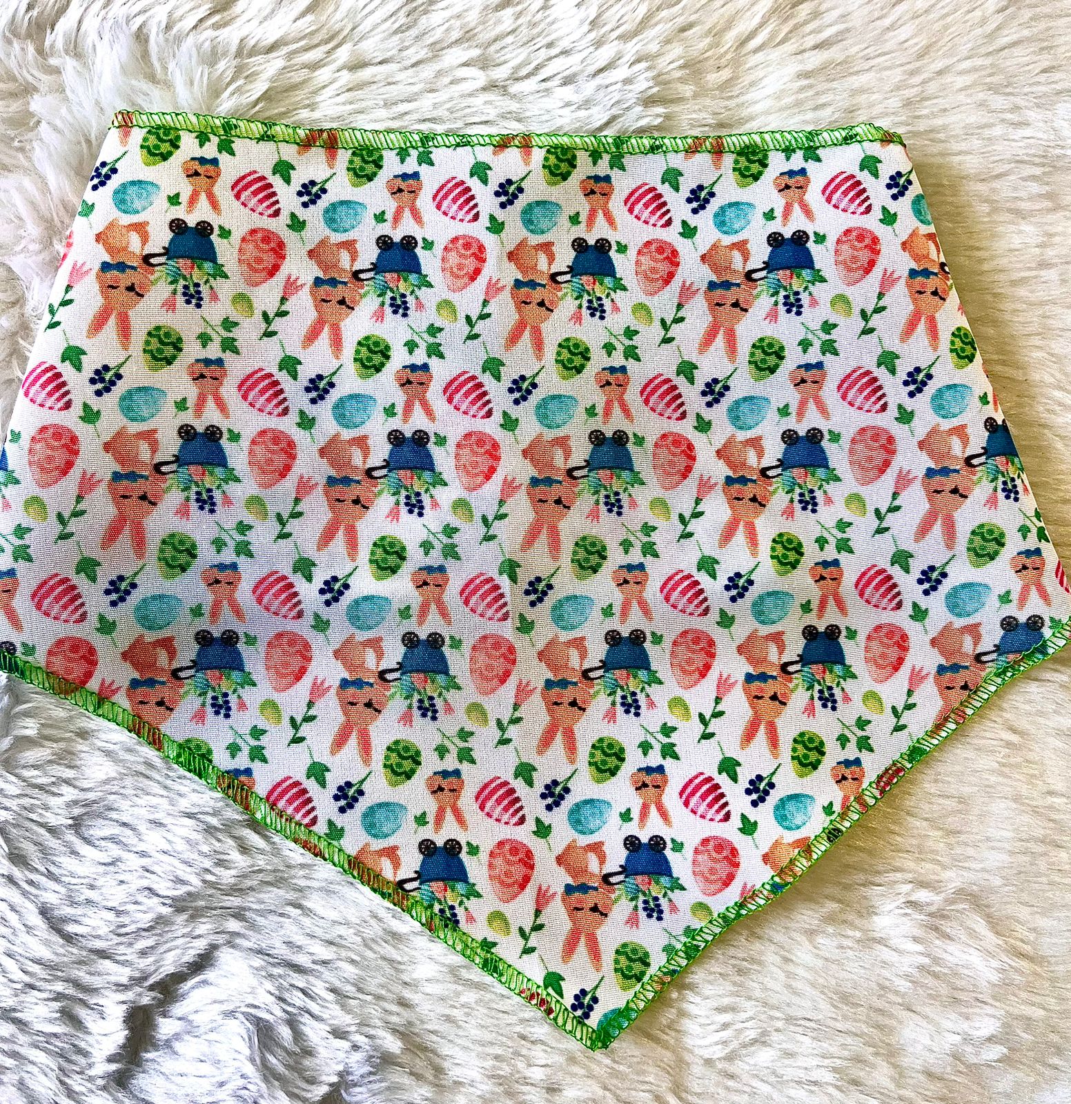 bandanas confeccionadas em tecido microfibra com acabamento de borda em costura overlock, temas, cores e estampas variadas de PASCOA.