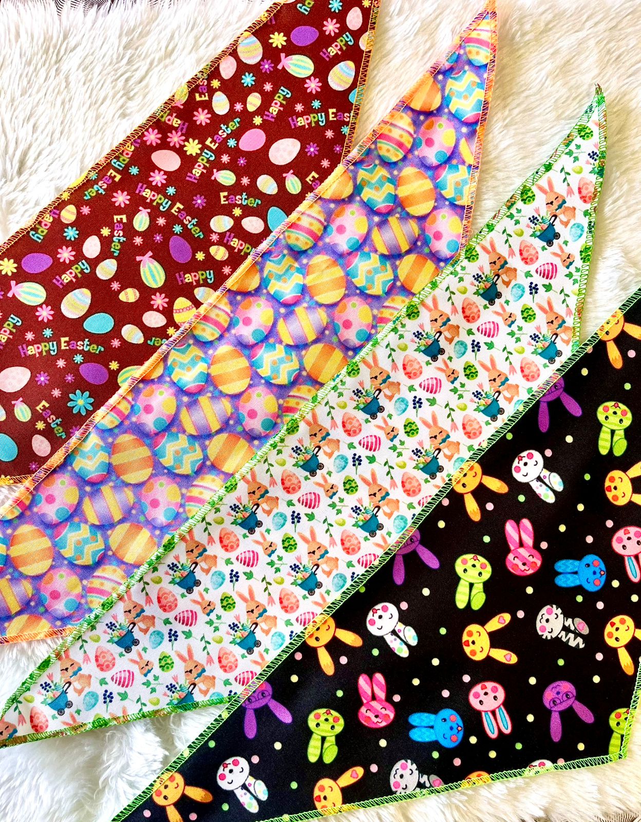 bandanas confeccionadas em tecido microfibra com acabamento de borda em costura overlock, temas, cores e estampas variadas de Pascoa.
