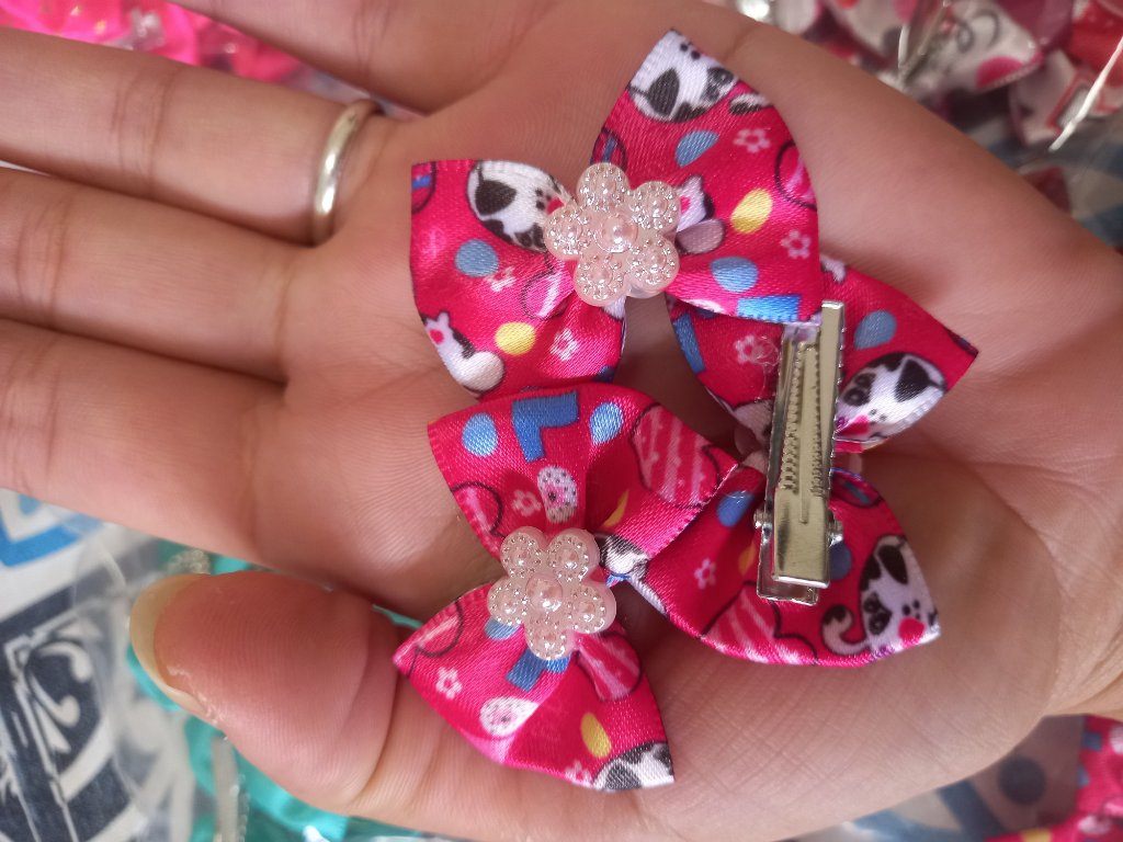Contém 5 laços, cores e apliques sortidos, com bico de pato. Tamanho médio 4,5cm