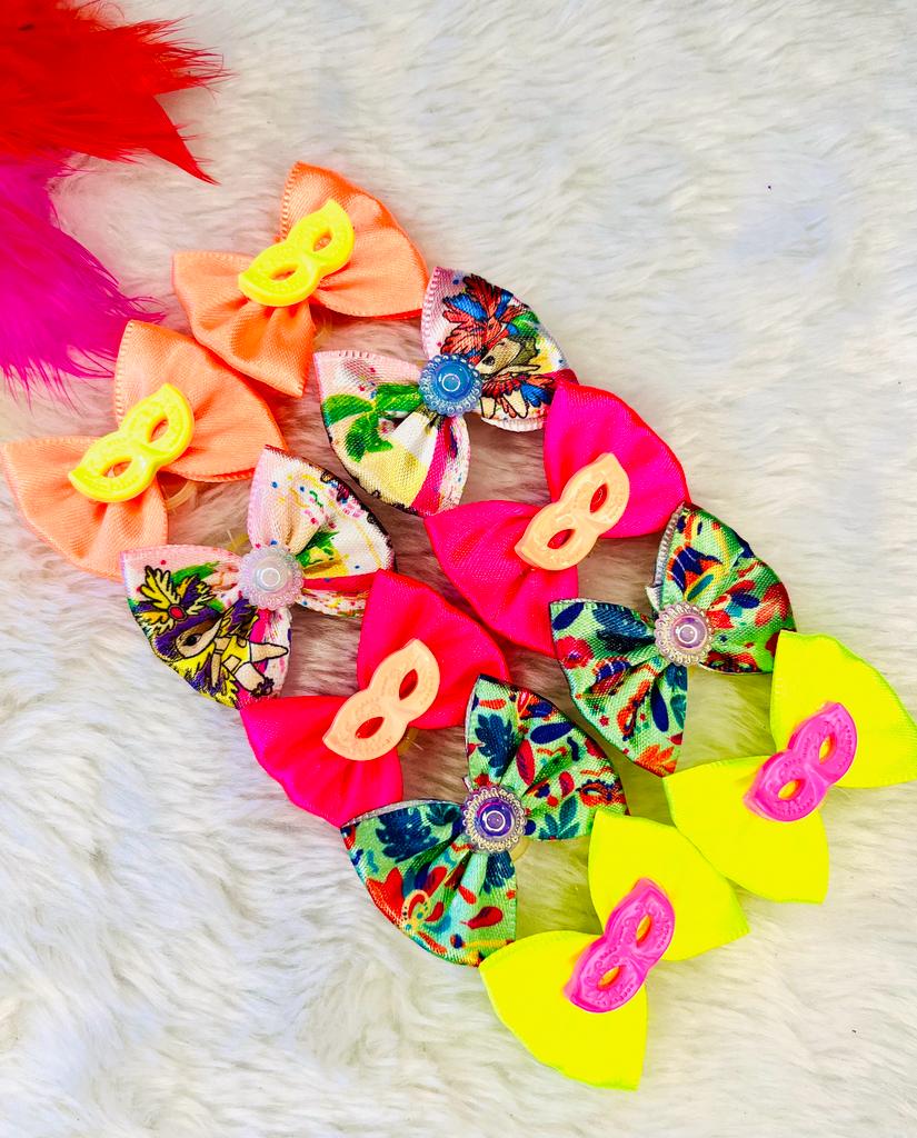 contem 5 pares de lacos tamanho medio 4,5cm, cores e estampas sortidas. tematicos de carnaval.
